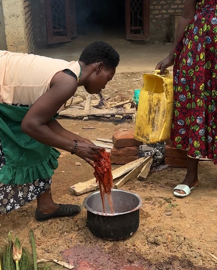 The natural dyes are created by heating the plant fibers with water in metal tubs over open flames. The raffia is added to simmer in the dye bath until the color saturates the raffia - the longer the raffia is allowed to sit in the dye bath the deeper the natural color becomes.